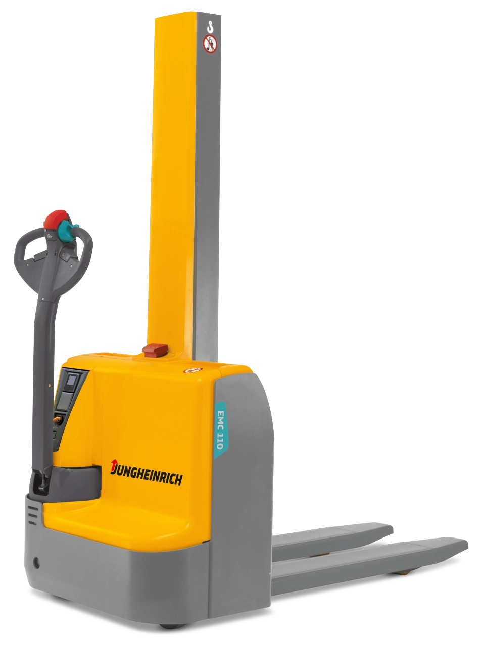 Los apiladores eléctricos de barra timón flexibles y robustos EMC 110/EMC B10 convencen por su versatilidad. Gracias a la corta longitud de la estructura delantera y al peso reducido de la carretilla, estas son ideales para el apilado ocasional y el transporte de mercancías en espacios estrechos, en montacargas, o en entreplantas. El motor de tracción potente y sin mantenimiento en tecnología de corriente trifásica de 24 V crea las condiciones ideales para un despacho de mercancías rápido y eficiente, así como un trabajo rentable. El innovador cabezal de barra timón multifuncional con diseño intuitivo para usuarios zurdos y diestros, así como el pulsador de marcha lenta, permiten maniobras seguras y muy lentas con la barra timón en posición vertical. Esto aumenta la maniobrabilidad en espacios estrechos. La EMC convence también en lo que respecta a la ergonomía. Gracias al cargador de batería integrado es posible cargar las baterías monobloque de 70 Ah sin mantenimiento en cualquier toma de corriente de red de 230 V. El indicador de descarga de batería indica en todo momento el estado de carga de la batería.