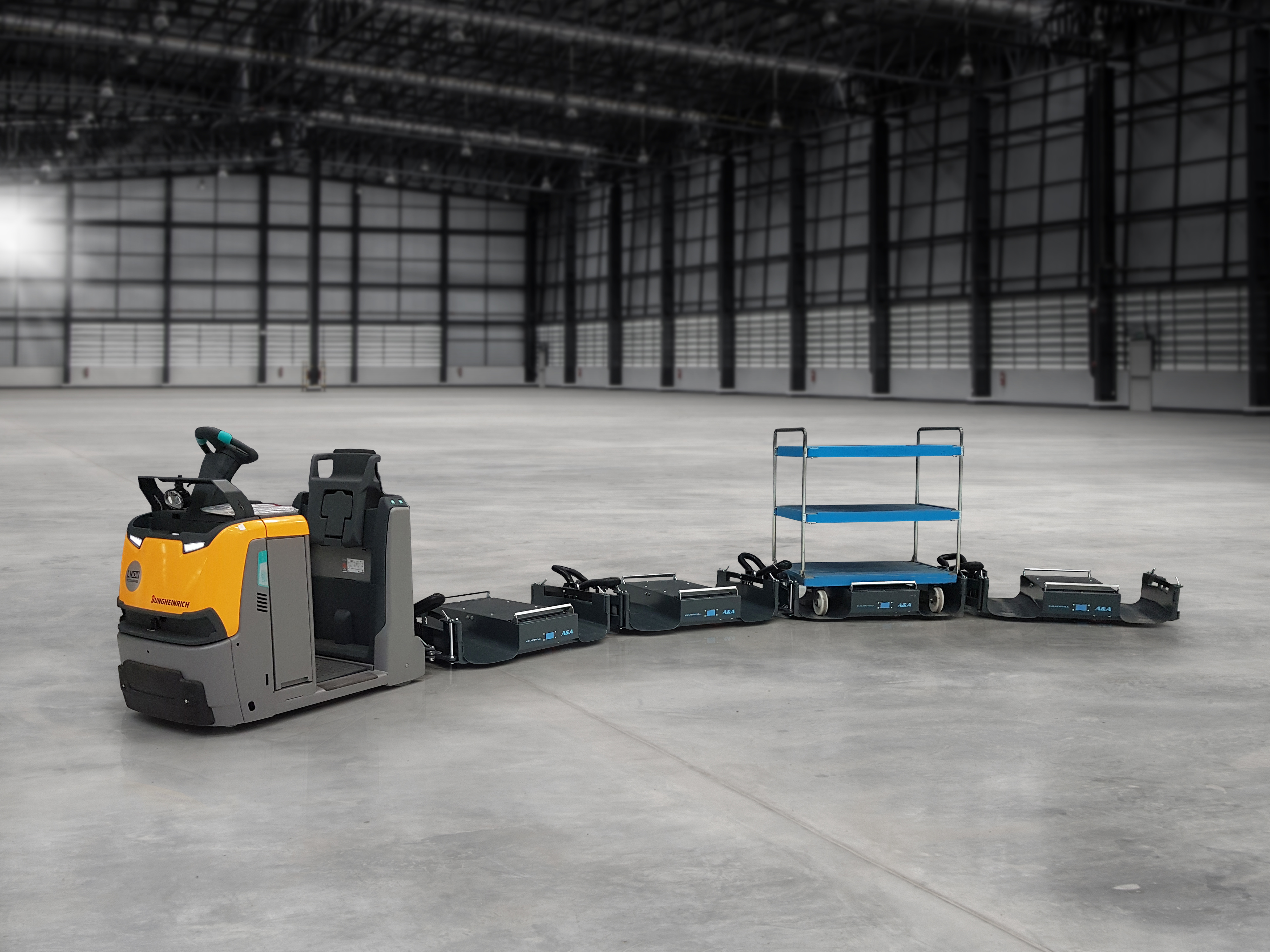 Con las remolcadoras (tractoras) eléctricas de Jungheinrich de las series EZS 1, 3 y 5 se pueden acoplar hasta ocho remolques en el sistema de tren de arrastre LiftLiner®. "Este sistema de remolques es una solución innovadora y eficaz con un diseño incomparablemente compacto", dice Matthias Maurin, Jefe del segmento de producto de remolcadoras en Jungheinrich. La dirección patentada ofrece un radio de giro reducido y una maniobrabilidad excelente. La alta seguridad y la ergonomía durante el uso son características clave del sistema.